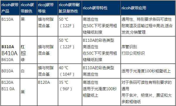 B210A :顏色 藍,蠟與樹脂混合基,50℃(122F),B110A的彩色類型,高適應性,在50℃下可承受用粗糙箱紙刮擦,庫管識別,打印公司標識