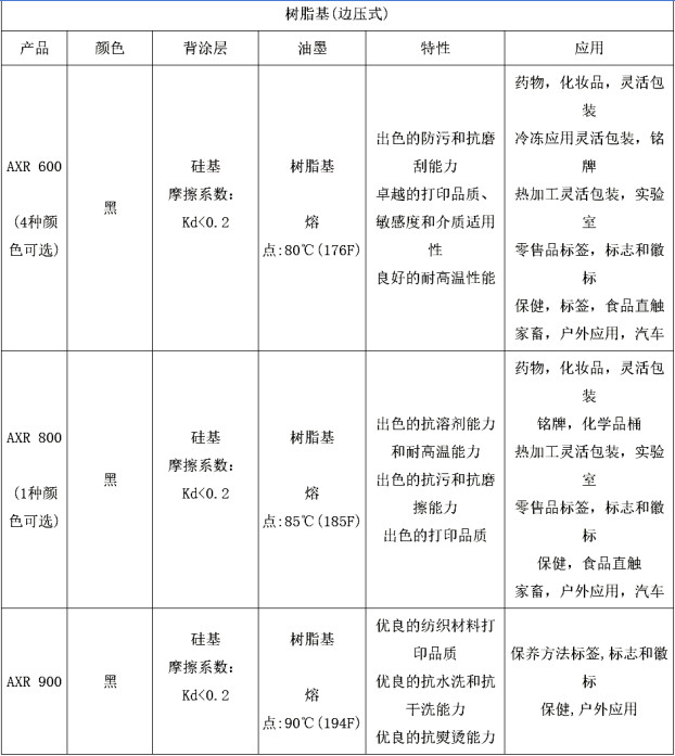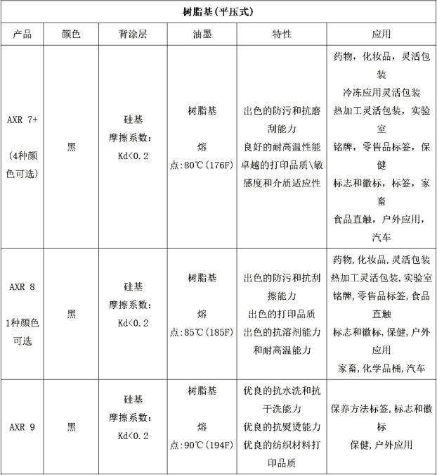 樹脂基:AXR®樹脂基系列主要應(yīng)用于非常高要求的打印上。ARMOR的樹脂基碳帶系列質(zhì)量卓越,特別適合在合成材料(PE、PP、PET......)這些高性能的碳帶具有很強的抵抗性;抗磨刮性,耐高溫,耐酒精和一些清潔溶劑。有些還用于特定打印(例如紡織品)。