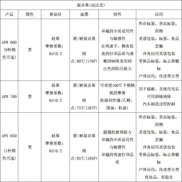 混合基:APR®/APX®混合基系列擁有出色的打印品質(zhì)和適用范圍極廣。此系列的碳帶在涂層紙,合成材料(PE、PP、PET......)上打印效果出眾。同時具有良好的抗磨刮性,能夠清晰地列出90°條形碼,清晰度極高,出眾的背涂技術(shù),確保能呵護打印頭并延長其使用壽命。